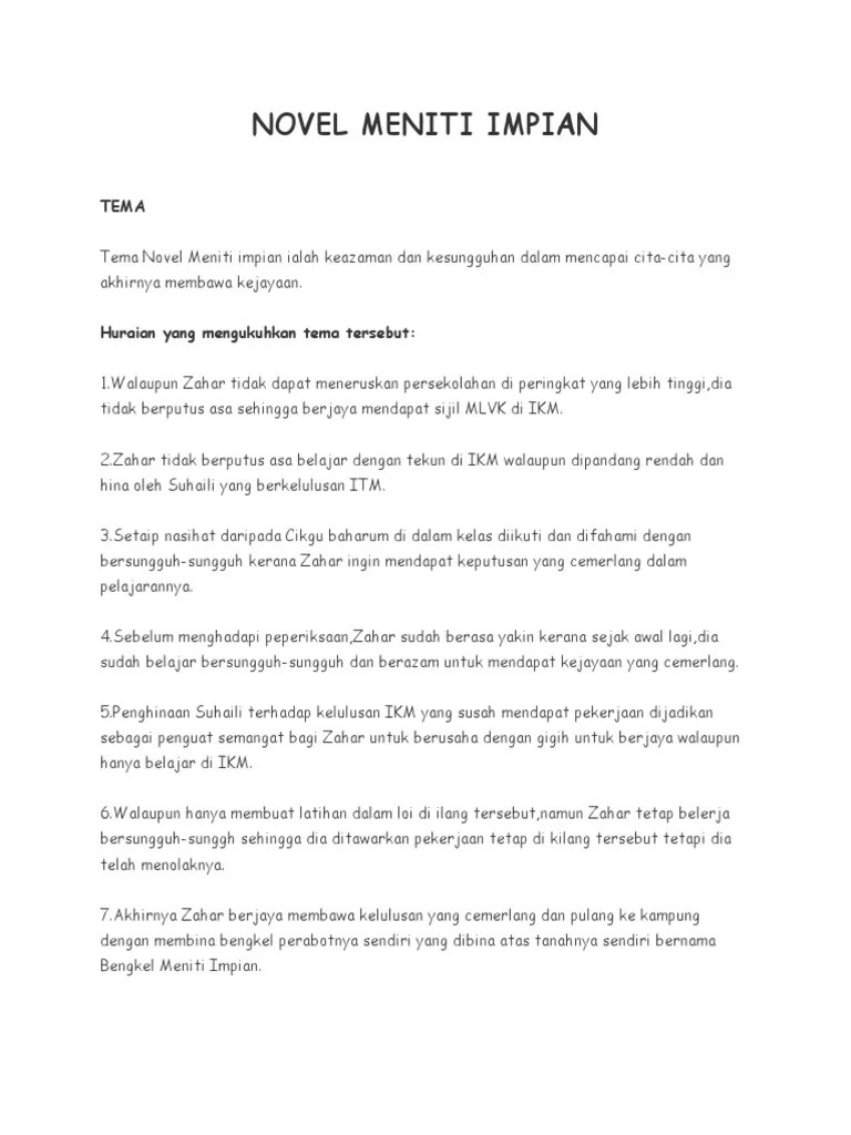 Meniti impian sinopsis keseluruhan novel meniti impian berkisar tentang zahar, iaitu pelajar yang mempunyai Sinopsis bab 4, 5, 6 (novel tingkatan 2) bab 4: Zahar kagum melihat peralatan yang serba lengkap di dalam bengkel.